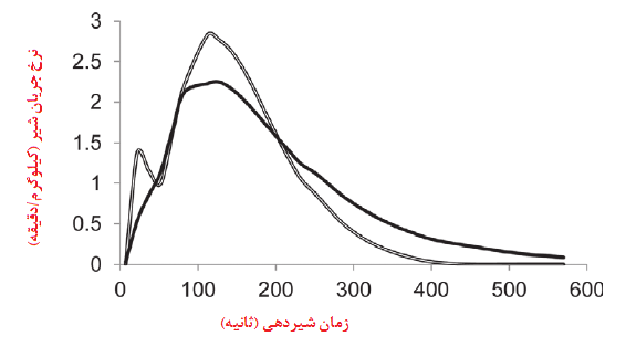 برای مثال به نمودار زیر که بیانگر نحوه و سرعت خروج شیر از پستان گاو می باشد دقت کنید. با مقایسه نمودار خروج شیر از پستان یک گاو با نمودار استاندارد، می توان به سالم بودن گاو یا بیمار بودن او تا حدودی پی برد. طبیعی است که قطع شدن های مکرر خروج شیر در بازه دوشش در یک وعده، طولانی شدن آزادسازی شیر، کند بودن خروج شیر، کوتاه بودن بازه شیردهی در یک وعده و مانند آن به چه میزان به ما اطلاعات مهمی در خصوص سلامت گاو می دهد. اطلاعاتی که میلکمتر مکانیکی در هیچ صورتی توان تولید و ارایه آن به شما را ندارد.