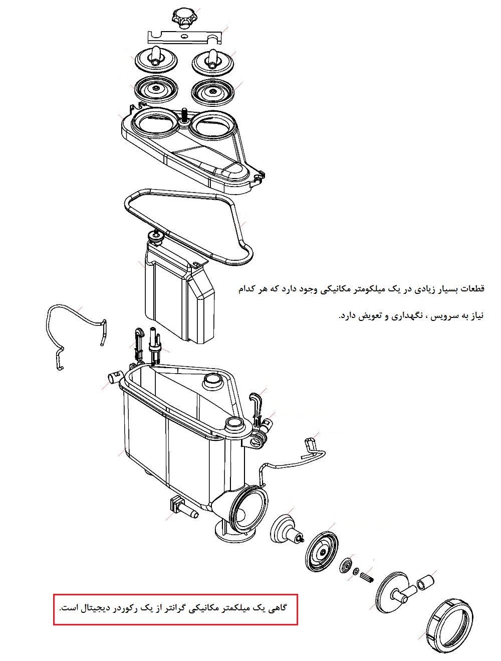 تصویر بالا به خوبی بیانگر تعداد زیاد قطعات به کار رفته در یک میلکمتر مکانیکی است. به خوبی روشن است که هر گونه اختلال در عملکرد هر یک از این قطعه ها، باعث از کار افتادن میلکمتر و تشخیص نادرست میزان تولید شیر می شود.
