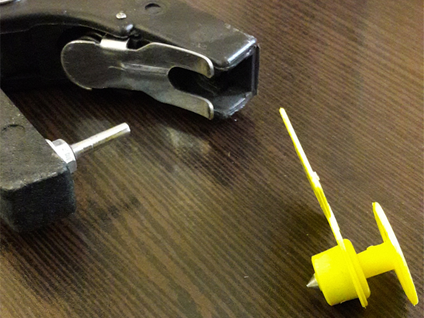سپس پلاک گوش را بر روی قسمت دیگر پنس جایگذاری کنید و با استفاده از فنر تعبیه شده روی پنس، پلاک را مهار کنید. در این حالت در صورت تکان خوردن پنس، پلاک و میخ نمی بایست از پنس جدا شوند. اکنون با چند بار باز و بسته کردن پنس مطمئن شوید که میخ به درستی در مادگی فرو می رود.